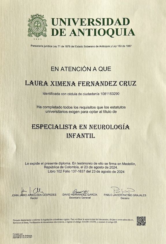 Soy médica especialista en Pediatría egresada de la Universidad Surcolombiana y subespecialista en Neurología Infantil por la Universidad de Antioquia. Mi formación académica y experiencia clínica me han permitido adquirir un profundo conocimiento en el diagnóstico y tratamiento de los trastornos neurológicos pediátricos, con un enfoque centrado en el bienestar integral de los niños y su neurodesarrollo.